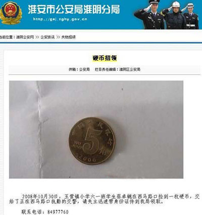 這則5毛錢招領(lǐng)告示系江蘇省淮安市淮陰公安分局所發(fā)。啟示稱,“王營鎮(zhèn)小學(xué)六一班學(xué)生蔡卓樾在西馬路口撿到一枚硬幣,交給了正在西馬路口執(zhí)勤的交警,請(qǐng)失主迅速帶身份證件到我局領(lǐng)取”。啟示上還附有照片,一枚銹跡斑斑的5毛錢硬幣,靜靜躺在照片里。據(jù)悉,這是他們根據(jù)上級(jí)的要求,作為政府信息公開的具體實(shí)施步驟,通過互聯(lián)網(wǎng)發(fā)布失物招領(lǐng)信息。記者搜索到5毛錢硬幣頁面已被刪除。不過,能通過“快照”看到。