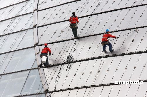 2月23日,幾名“蜘蛛人”保潔人員正在清洗北京國家大劇院外壁及景觀池玻璃上的塵土,使其以靚麗清潔的外觀迎接全國兩會(huì)的召開。