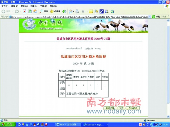 2月20日,即鹽城水源污染、全市停水當(dāng)天,就有網(wǎng)友在鹽城當(dāng)?shù)卣搲N出了政府網(wǎng)站“中國(guó)鹽城”當(dāng)天公布的2009年第08周《鹽城市市區(qū)水源水質(zhì)周報(bào)》(以下簡(jiǎn)稱(chēng)“0908期周報(bào)”),這份由鹽城環(huán)保局提供的報(bào)告顯示,在第8周的監(jiān)測(cè)中,除高錳酸鹽指數(shù)為Ⅲ類(lèi)外,包括氟化物、氯化物、揮發(fā)酚、總砷、六價(jià)鉻在內(nèi)的其他五項(xiàng)監(jiān)控指標(biāo)均為I類(lèi),結(jié)論是“本周飲用水源水質(zhì)符合標(biāo)準(zhǔn)”。