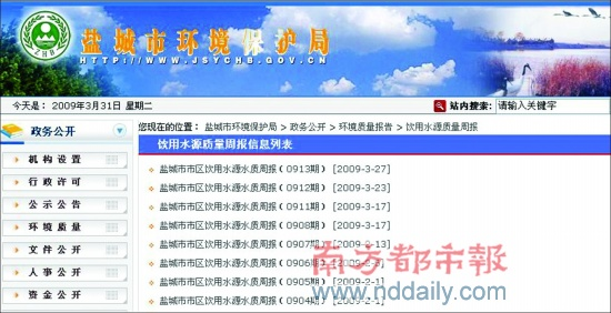 記者昨天登錄“中國(guó)鹽城”網(wǎng)站后發(fā)現(xiàn),在便民信息公開(kāi)的欄目里,原發(fā)布于2月20日的0908期周報(bào)已經(jīng)不見(jiàn)了,取而代之的,是發(fā)布于3月16日的另一份0908期周報(bào)。從內(nèi)容上看,這份周報(bào)與帖主提供的截圖版本完全一致,只是標(biāo)注“鹽城市環(huán)境保護(hù)局2009年2月20日”。而這也與鹽城市環(huán)保局網(wǎng)站于3月17日發(fā)布的0908期報(bào)道內(nèi)容完全相同。