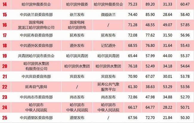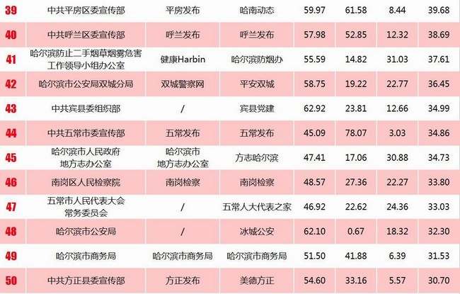《報告》推出“哈爾濱政務(wù)新媒體綜合影響力榜單”“哈爾濱市直單位政務(wù)新媒體綜合影響力榜單”“哈爾濱區(qū)、縣(市)政務(wù)新媒體綜合影響力榜單”“哈爾濱基層單位政務(wù)新媒體綜合影響力榜單”“哈爾濱市新聞單位新媒體影響力榜單”,統(tǒng)計時間為2014至2016年。在全市綜合影響力十強榜單中,市直機構(gòu)呈現(xiàn)壓倒性優(yōu)勢,占據(jù)7個席位,區(qū)縣(市)機構(gòu)占據(jù)3席。