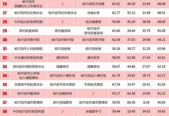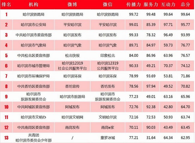 《報告》從傳播力、服務(wù)力、互動力三個維度對哈爾濱市政務(wù)機構(gòu)和媒體機構(gòu)開設(shè)的微博、微信賬號進行綜合考量和系統(tǒng)評估分析,客觀地反映了哈爾濱市各級黨政機關(guān)在政務(wù)新媒體平臺中的綜合表現(xiàn)?!秷蟾妗分赋觯航陙恚枮I各級黨政部門政務(wù)新媒體意識不斷增強,“雙微”平臺在發(fā)布內(nèi)容上更趨多元、風(fēng)格更加親民、互動明顯增強,已成為傳遞黨和政府聲音、回應(yīng)公眾關(guān)切、創(chuàng)新工作形式、提高政務(wù)效能的重要載體。截至目前,已報備登記的哈爾濱政務(wù)新媒體607個,無論是賬號數(shù)量還是影響力都在全省各地市居遙遙領(lǐng)先地位?!癅哈爾濱發(fā)布”連續(xù)三年在全國政務(wù)新媒體排行中進入百強?!癅哈爾濱鐵路局”“@平安哈爾濱”在本行業(yè)本系統(tǒng)政務(wù)新媒體排行中也躋身先進行列。