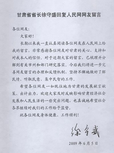 甘肅省省長徐守盛致網(wǎng)友的信