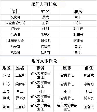 免去張平的國務(wù)院副秘書長職務(wù);免去歐新黔(女)的國家發(fā)展和改革委員會副主任職務(wù);免去牟新生的海關(guān)總署署長職務(wù);免去李傳卿的國家質(zhì)量監(jiān)督檢驗檢疫總局副局長職務(wù);免去李毅中的國家安全生產(chǎn)監(jiān)督管理總局局長職務(wù)。