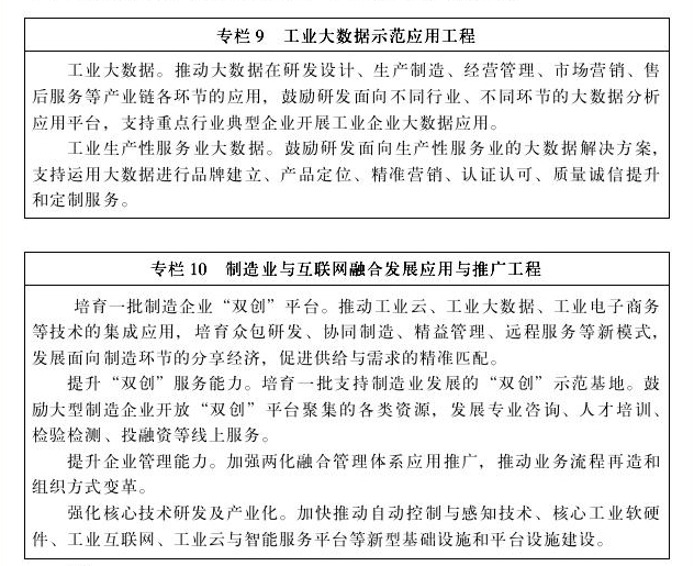 目標(biāo):到2020年,互聯(lián)網(wǎng)協(xié)議第6版(IPv6)大規(guī)模部署和商用,5G開(kāi)始商用部署;“互聯(lián)網(wǎng)+工業(yè)”發(fā)展取得明顯成效,培育1個(gè)國(guó)家級(jí)制造業(yè)創(chuàng)新中心(工業(yè)技術(shù)研究基地),建設(shè)“工業(yè)云”大數(shù)據(jù)中心;實(shí)施100個(gè)數(shù)字化車間、1000條自動(dòng)化生產(chǎn)線的智能制造試點(diǎn)示范工程,規(guī)模以上工業(yè)企業(yè)互聯(lián)網(wǎng)應(yīng)用普及率達(dá)到90%以上;構(gòu)建適應(yīng)信息時(shí)代跨界創(chuàng)新、融合創(chuàng)新和迭代創(chuàng)新的體制機(jī)制;創(chuàng)新民生服務(wù)供給模式,創(chuàng)新社會(huì)治理方式,基本形成創(chuàng)新的發(fā)展環(huán)境。