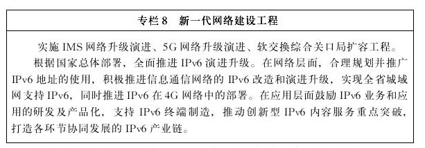 實(shí)施“寬帶龍江”戰(zhàn)略。加快新一代互聯(lián)網(wǎng)布局,打造全光纖網(wǎng)絡(luò)城市,推進(jìn)互聯(lián)網(wǎng)進(jìn)村入戶,提升信息網(wǎng)絡(luò)服務(wù)能力。實(shí)施寬帶網(wǎng)絡(luò)建設(shè)工程、新一代網(wǎng)絡(luò)建設(shè)工程和應(yīng)急保障工程,構(gòu)建高速寬帶、天地一體、泛在智能、安全可控、敏捷開(kāi)放的新一代信息網(wǎng)絡(luò)。推進(jìn)提速降費(fèi),降低互聯(lián)網(wǎng)資費(fèi)水平,增加骨干網(wǎng)絡(luò)傳輸容量,提高寬帶接入速率。建設(shè)一批全光網(wǎng)城市,推進(jìn)網(wǎng)絡(luò)進(jìn)村入戶。消除寬帶網(wǎng)絡(luò)接入“最后一公里”瓶頸,進(jìn)一步推進(jìn)網(wǎng)絡(luò)提速降費(fèi)。加強(qiáng)信息基礎(chǔ)設(shè)施與市政、公路、鐵路、機(jī)場(chǎng)等規(guī)劃建設(shè)的銜接。科學(xué)靈活選擇移動(dòng)蜂窩、衛(wèi)星通信等接入技術(shù),分類推進(jìn)農(nóng)村、邊遠(yuǎn)地區(qū)、林區(qū)的網(wǎng)絡(luò)覆蓋。