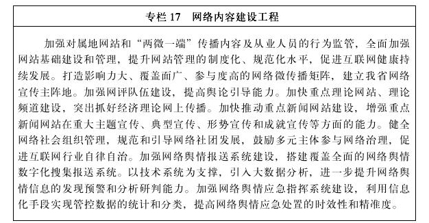 打造綠色網(wǎng)絡(luò)空間。依法加強(qiáng)網(wǎng)絡(luò)空間治理,充分運(yùn)用技術(shù)平臺(tái)、大數(shù)據(jù)等信息化手段,提高互聯(lián)網(wǎng)治理水平,監(jiān)管媒體傳播內(nèi)容,規(guī)范媒體社會(huì)責(zé)任及其從業(yè)人員應(yīng)承擔(dān)的社會(huì)義務(wù),提高網(wǎng)絡(luò)輿情服務(wù)保障能力。開(kāi)展網(wǎng)絡(luò)輿論引導(dǎo),加強(qiáng)對(duì)網(wǎng)絡(luò)傳播平臺(tái)的管理,強(qiáng)化網(wǎng)評(píng)員隊(duì)伍建設(shè)與管理,提高輿論引導(dǎo)能力。加快建立政府引領(lǐng),企業(yè)、社會(huì)組織、技術(shù)社群、公民共同參與、相互協(xié)作的互聯(lián)網(wǎng)治理機(jī)制,強(qiáng)化互聯(lián)網(wǎng)企業(yè)的主體責(zé)任。加快網(wǎng)絡(luò)輿情應(yīng)急指揮體系建設(shè),完善應(yīng)急協(xié)調(diào)聯(lián)動(dòng)機(jī)制。加強(qiáng)個(gè)人數(shù)據(jù)保護(hù),依法打擊網(wǎng)絡(luò)違法犯罪。牢牢掌握網(wǎng)絡(luò)意識(shí)形態(tài)斗爭(zhēng)主動(dòng)權(quán),堅(jiān)決防范和打擊通過(guò)網(wǎng)絡(luò)分裂國(guó)家、煽動(dòng)叛亂、顛覆政權(quán)、破壞統(tǒng)一、竊密泄密等行為,切實(shí)維護(hù)國(guó)家政治安全。加強(qiáng)網(wǎng)絡(luò)生態(tài)綜合治理,依法依規(guī)整治網(wǎng)上各類違法違規(guī)行為,規(guī)范網(wǎng)絡(luò)傳播秩序。