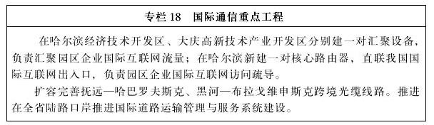 目標(biāo):到2020年,形成與俄羅斯等有關(guān)國(guó)家的信息經(jīng)濟(jì)合作大通道,在信息基礎(chǔ)設(shè)施、智慧城市、電子商務(wù)、遠(yuǎn)程醫(yī)療等領(lǐng)域開(kāi)展實(shí)質(zhì)合作;提升哈爾濱區(qū)域性國(guó)際通信業(yè)務(wù)出入口能力,建成中俄互聯(lián)網(wǎng)高速通道,有效推進(jìn)中俄跨境光纜建設(shè)。