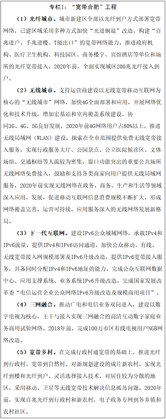 積極推進國家新型智慧城市、信息惠民、互聯(lián)網(wǎng)+政務服務、寬帶中國、高性能集成電路、新型平板顯示、物聯(lián)網(wǎng)和云計算等試點、示范工程和產(chǎn)業(yè)化項目,爭取國家支持相關領域的先行先試,形成帶動引領效應。結合各縣(市)區(qū)特色和各自基礎,組織開展智慧城市試點示范區(qū)(園區(qū)、街鎮(zhèn)、社區(qū))建設,開展“數(shù)字工廠”和“數(shù)字園區(qū)”示范。聚焦量子通信、智能語音等優(yōu)勢特色領域,結合云計算、大數(shù)據(jù)、物聯(lián)網(wǎng)等新一代信息技術產(chǎn)業(yè)和新興業(yè)態(tài),組織一批高技術產(chǎn)業(yè)化示范工程和產(chǎn)業(yè)化基地建設,促進新興產(chǎn)業(yè)和新業(yè)態(tài)發(fā)展。