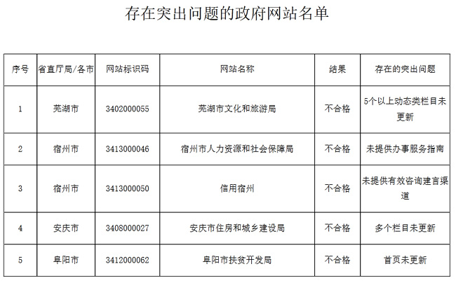 截至8月28日,我省在全國政府網(wǎng)站信息報送系統(tǒng)中備案政府網(wǎng)站807家。其中,省人民政府門戶網(wǎng)站1家,省級政府部門網(wǎng)站及專項網(wǎng)站52家,市、縣級政府門戶網(wǎng)站121家,市級政府部門網(wǎng)站及專項網(wǎng)站633家。本次檢查發(fā)現(xiàn),黃山、阜陽、合肥和淮北市政府門戶網(wǎng)站建設較好、得分較高。經(jīng)抽樣復核,各市上報的政府網(wǎng)站和政務新媒體日常監(jiān)測結果整體真實準確。