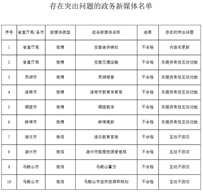 ?。ㄈ┱招旅襟w檢查情況。對省直有關單位、賬號開設主體為市縣級人民政府的政務新媒體(含APP),以及160個其他政務新媒體開展檢查調研,重點排查政務新媒體安全隱患、內(nèi)容不更新、互動回應差等問題。檢查發(fā)現(xiàn)10個政務新媒體不合格。