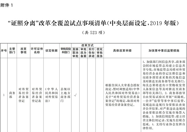 附件:1.“證照分離”改革全覆蓋試點事項清單(中央層面設定,2019年版)