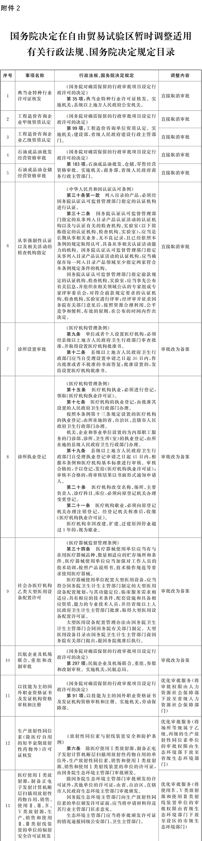 2.國務院決定在自由貿易試驗區(qū)暫時調整適用有關行政法規(guī)、國務院決定規(guī)定目錄