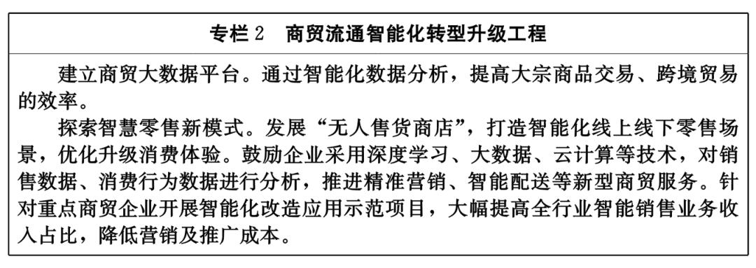 3.智能商務。鼓勵跨媒體分析與推理、知識計算引擎與知識服務等新技術在商務領域應用,推廣基于人工智能的新型商務服務與決策系統(tǒng)。積極支持各類特色商務云平臺、電子商務服務平臺發(fā)展,推進商務信用信息綜合平臺建設,加快推動企業(yè)及平臺數字化、智能化轉型。拓展商務大數據采集和分析應用,加快精準營銷、智能配送、供應鏈管理等新型商貿服務發(fā)展,支持人工智能技術在現代商務全流程的示范應用及創(chuàng)新。
