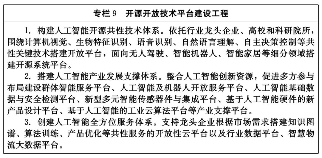 整體提升人工智能行業(yè)創(chuàng)新支撐能力,有效降低中小微企業(yè)研發(fā)成本,支持企業(yè)聯(lián)合高校、科研院所建設產學研用協(xié)同創(chuàng)新研發(fā)平臺,搭建數據開放平臺、開源開放共性技術平臺,鼓勵各類創(chuàng)新主體建設行業(yè)公共服務平臺,促進人才要素等創(chuàng)新資源集聚。