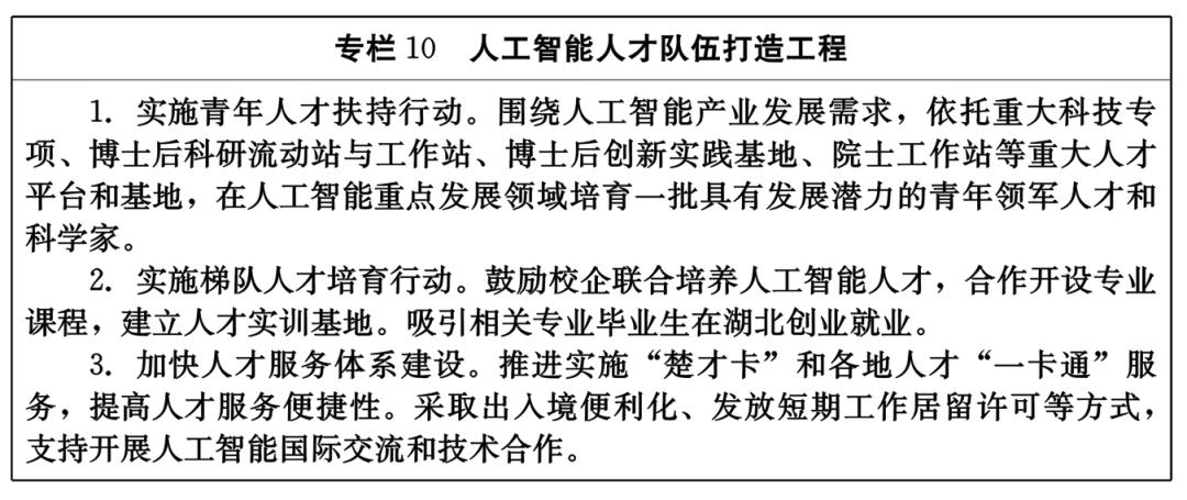 (四)構建人工智能人才高地。引導和鼓勵高校設立人工智能相關學科專業(yè),支持高校人工智能學科建設。構建政產學研用聯(lián)動的人才需求對接和定向培養(yǎng)機制,依托武漢大學、華中科技大學、武漢理工大學等高校以及中科院測量與地球物理研究所等科研院所科教資源,加大人工智能人才培養(yǎng)力度,構建面向產業(yè)發(fā)展前沿的多層次、高質量人才團隊。鼓勵校企合作,在人工智能重點發(fā)展領域培育一批具有發(fā)展?jié)摿Φ那嗄觐I軍人才和科學家。大力引進人工智能基礎理論、關鍵技術等領域的高端緊缺人才和高水平創(chuàng)新團隊。支持市場化培訓機構、人才繼續(xù)教育實訓基地和高技能人才培養(yǎng)基地等,開展人工智能緊缺急需專業(yè)技術人才和高技能人才培訓。鼓勵人工智能企業(yè)通過長短期聘用、項目合作、技術咨詢等柔性引才方式,靈活引進高端人才。向入選“楚才引領計劃”的人工智能領域高端緊缺人才發(fā)放“楚才卡”,提供落戶居留、子女就學、醫(yī)療保健、安居保障、出入境等“一卡通”專員服務。發(fā)揮股權激勵專項基金、人才發(fā)展基金等作用,留住并激勵人工智能高端人才。