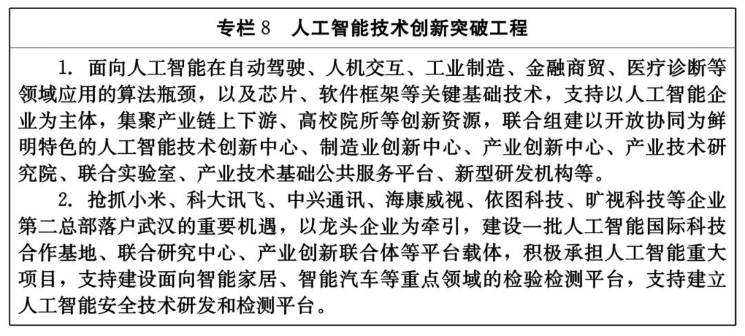?。ㄒ唬┙ㄔO協(xié)同創(chuàng)新研發(fā)平臺。重點支持高校、科研院所聯(lián)合人工智能企業(yè)建立有利于協(xié)同創(chuàng)新和成果轉化的新型研發(fā)機構、概念驗證實驗室等技術研發(fā)平臺,支持高校、企業(yè)申報國家級科研平臺,促進人工智能前沿核心技術和應用技術開發(fā)研究。面向全球精準引進一批人工智能領域世界先進水平科研中心、實驗室等國際高端研發(fā)機構。搶抓一批高科技龍頭企業(yè)第二總部落戶武漢的機遇,建設人工智能國際科技合作基地、聯(lián)合研究中心等平臺載體,積極承擔人工智能重大項目,形成產業(yè)技術創(chuàng)新高地。鼓勵建設人工智能領域國家級檢驗檢測平臺。