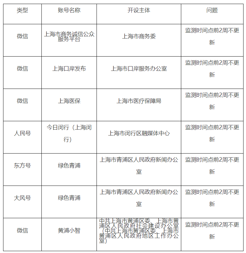 上海醫(yī)保、上??诎栋l(fā)布等4個政務(wù)微信賬號,上海閔行、綠色青浦等3個其他平臺賬號在監(jiān)測時點前兩周沒有更新。其中,在對前期排查整治過程中發(fā)的問題賬號復(fù)查中,發(fā)現(xiàn)黃浦小智政務(wù)微信賬號仍存在更新不及時現(xiàn)象,現(xiàn)已通報黃浦區(qū)政府安排專人、專項進行督導(dǎo)整改。