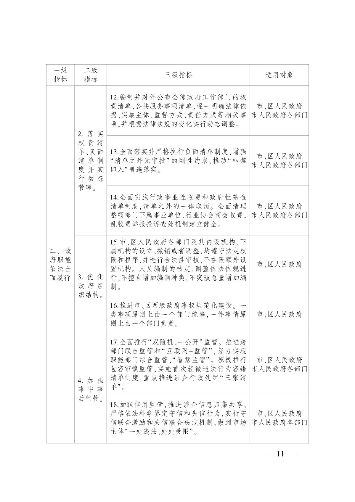 (二)依法全面履行政府職能,打造一流法治化營商環(huán)境。深化簡(jiǎn)政放權(quán)、放管結(jié)合、優(yōu)化服務(wù)改革,加快推進(jìn)數(shù)字政府建設(shè),重點(diǎn)推進(jìn)政務(wù)服務(wù)“一網(wǎng)通辦”、政府運(yùn)行“一網(wǎng)協(xié)同”、民生服務(wù)“一碼互聯(lián)”、企業(yè)服務(wù)“一站直通”,著力打造全國政務(wù)服務(wù)最優(yōu)城市。持續(xù)營造法治化營商環(huán)境,調(diào)整優(yōu)化權(quán)責(zé)清單管理,實(shí)施統(tǒng)一的市場(chǎng)準(zhǔn)入負(fù)面清單制度。加強(qiáng)和創(chuàng)新事中事后監(jiān)管,推進(jìn)“雙隨機(jī)、一公開”跨部門聯(lián)合監(jiān)管,強(qiáng)化重點(diǎn)領(lǐng)域重點(diǎn)監(jiān)管。持續(xù)開展“減證便民”行動(dòng),推行證明事項(xiàng)告知承諾制。依法實(shí)施應(yīng)急處置措施,全面提高依法應(yīng)對(duì)突發(fā)事件能力和水平。