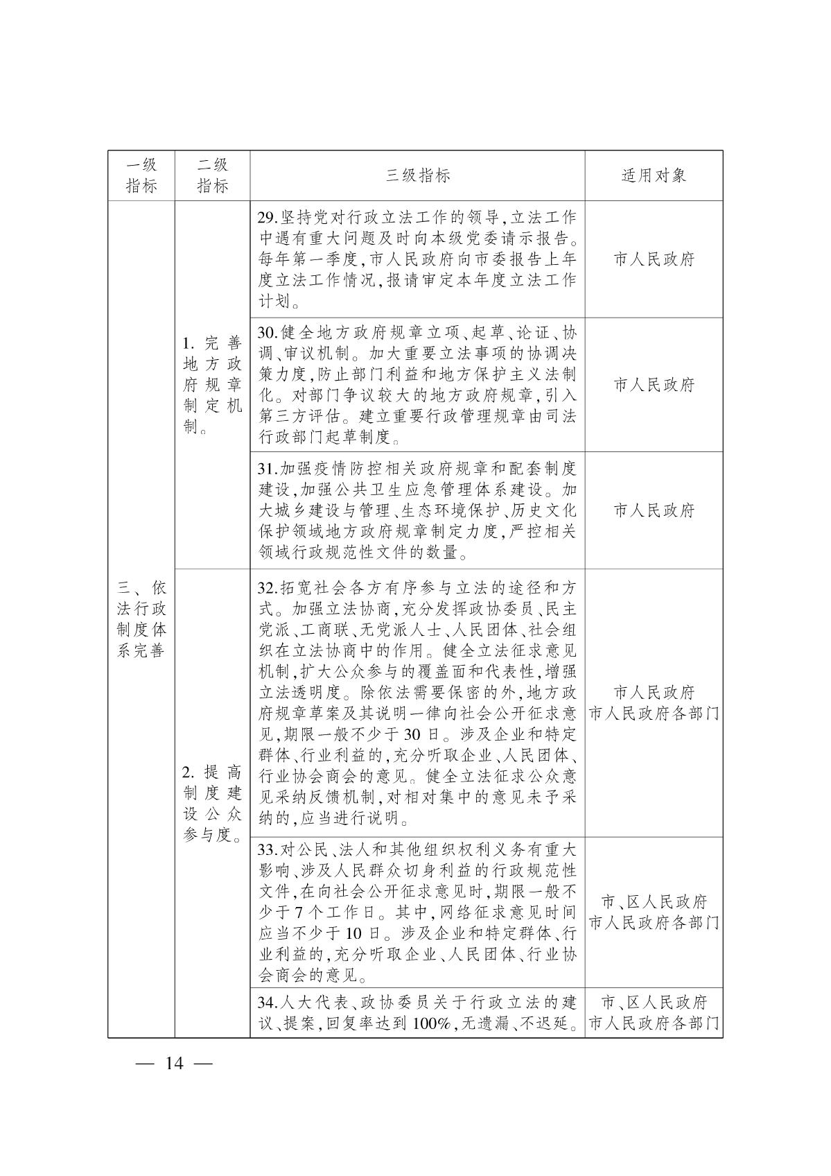 (三)加強(qiáng)政府立法和行政規(guī)范性文件監(jiān)管,構(gòu)建系統(tǒng)完備、科學(xué)規(guī)范、運(yùn)行有效的依法行政制度體系。加強(qiáng)重點(diǎn)領(lǐng)域立法,圍繞推動(dòng)創(chuàng)新驅(qū)動(dòng)發(fā)展、優(yōu)化營商環(huán)境、實(shí)現(xiàn)城市精細(xì)化管理、加強(qiáng)民生幸福保障、加強(qiáng)生態(tài)文明建設(shè)、促進(jìn)文化繁榮發(fā)展、強(qiáng)化疫情防控和公共衛(wèi)生應(yīng)急管理體系建設(shè)等重要領(lǐng)域,加快推進(jìn)經(jīng)濟(jì)社會(huì)發(fā)展急需的政府立法。深入推進(jìn)科學(xué)立法、民主立法、依法立法,嚴(yán)格履行政府規(guī)章和行政規(guī)范性文件制定、備案程序,強(qiáng)化公眾參與、審查審核和評(píng)估論證工作,加強(qiáng)基層立法聯(lián)系點(diǎn)建設(shè),推動(dòng)完善行政規(guī)范性文件統(tǒng)一發(fā)布機(jī)制。加快特定領(lǐng)域的地方性法規(guī)、政府規(guī)章和行政規(guī)范性文件清理進(jìn)度,清理結(jié)果向社會(huì)公布,并及時(shí)做好立改廢工作。
