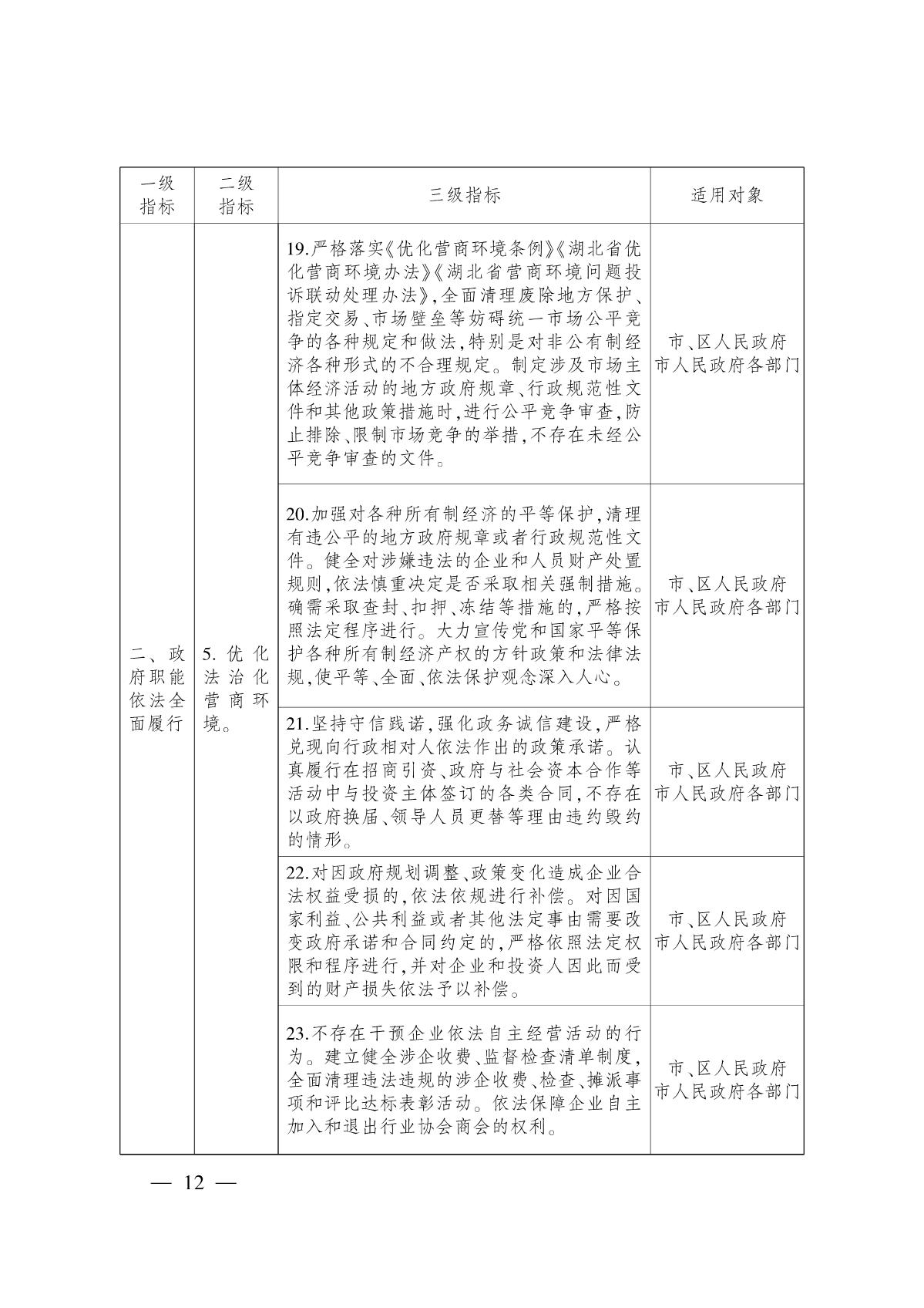 (二)工作目標(biāo)。到2024年,市人民政府及其部門、各區(qū)人民政府(含武漢東湖新技術(shù)開發(fā)區(qū)、武漢經(jīng)濟(jì)技術(shù)開發(fā)區(qū)、市東湖生態(tài)旅游風(fēng)景區(qū)管委會(huì),下同)基本實(shí)現(xiàn)《武漢市法治政府建設(shè)示范創(chuàng)建指標(biāo)體系》(以下簡(jiǎn)稱市指標(biāo)體系)確定的工作目標(biāo),并在優(yōu)化法治化營商環(huán)境、依法全面履行政府職能、完善依法行政制度建設(shè)、科學(xué)民主依法決策、嚴(yán)格規(guī)范公正文明執(zhí)法、健全行政復(fù)議體制機(jī)制以及其他法治政府建設(shè)等方面工作中產(chǎn)生一批具有創(chuàng)新性、引領(lǐng)性、典型性的做法,形成可復(fù)制、可推廣的經(jīng)驗(yàn);積極參與國家和本省法治政府建設(shè)示范創(chuàng)建活動(dòng),爭(zhēng)創(chuàng)新時(shí)代法治政府建設(shè)示范地區(qū)和項(xiàng)目,分階段有步驟全面推進(jìn)法治政府建設(shè)各項(xiàng)工作,切實(shí)推動(dòng)我市法治政府建設(shè)水平整體提升。