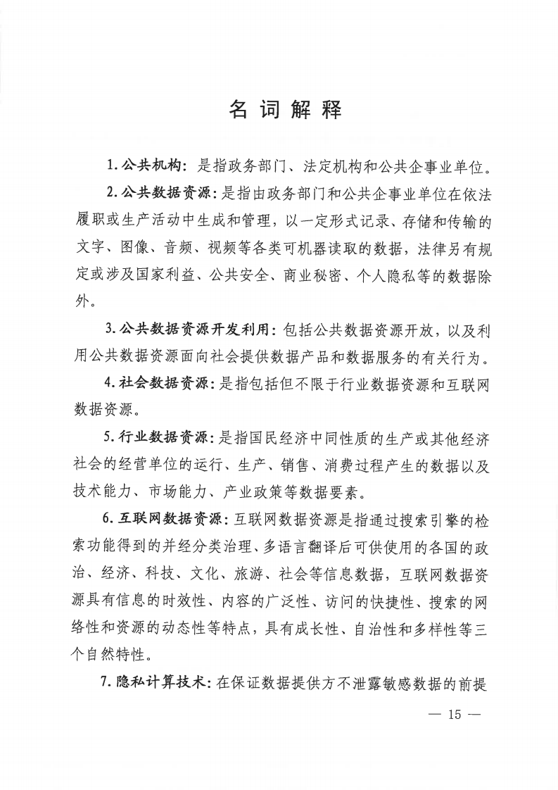 公共數(shù)據(jù)資源是指由政務部門和公共企事業(yè)單位在依法履職或生產(chǎn)活動中生成和管理,以一定形式記錄、存儲和傳輸?shù)奈淖帧D像、音頻、視頻等各類可機器讀取的數(shù)據(jù),法律另有規(guī)定或涉及國家利益、公共安全、商業(yè)秘密、個人隱私等的數(shù)據(jù)除外。