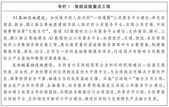 新技術(shù)平臺(tái):推動(dòng)智能設(shè)施規(guī)模級(jí)平臺(tái)和應(yīng)用場(chǎng)景建設(shè),充分發(fā)揮南昌“頭雁”作用,前瞻性部署一批AI、區(qū)塊鏈、VR、物聯(lián)網(wǎng)等城市級(jí)及以上平臺(tái),鼓勵(lì)各設(shè)區(qū)市結(jié)合本地智慧城市建設(shè)、特色產(chǎn)業(yè)發(fā)展需求,按需推進(jìn)AI、物聯(lián)網(wǎng)、區(qū)塊鏈等平臺(tái)設(shè)施建設(shè)。