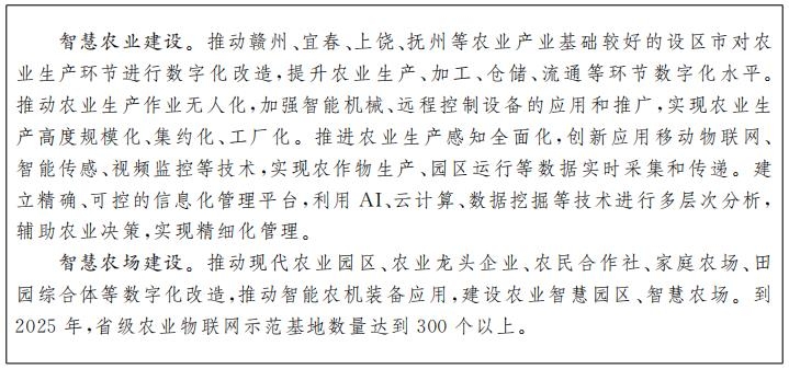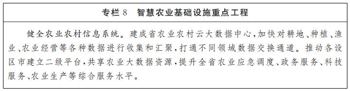 智慧農(nóng)業(yè)基礎(chǔ)設(shè)施建設(shè)。健全農(nóng)業(yè)農(nóng)村信息系統(tǒng),搭建農(nóng)業(yè)產(chǎn)業(yè)鏈大數(shù)據(jù)公共服務(wù)平臺(tái),加快全省農(nóng)業(yè)農(nóng)村數(shù)據(jù)向省農(nóng)業(yè)農(nóng)村云大數(shù)據(jù)中心匯集,全面提升涉農(nóng)數(shù)據(jù)采集、監(jiān)測(cè)、分析、決策支撐能力。建立重大建設(shè)項(xiàng)目占用永久基本農(nóng)田補(bǔ)劃情況及永久基本農(nóng)田儲(chǔ)備區(qū)數(shù)據(jù)庫。加快農(nóng)業(yè)生產(chǎn)環(huán)節(jié)數(shù)字化改造,推進(jìn)智慧農(nóng)場(chǎng)、智慧牧場(chǎng)、智慧漁場(chǎng)建設(shè),實(shí)施農(nóng)業(yè)物聯(lián)網(wǎng)示范工程,加快5G、物聯(lián)網(wǎng)、AI等技術(shù)以及無人機(jī)、農(nóng)業(yè)機(jī)器人等在種植業(yè)、畜牧業(yè)、漁業(yè)領(lǐng)域應(yīng)用推廣,實(shí)現(xiàn)農(nóng)業(yè)生產(chǎn)全面感知化、無人作業(yè)化、管理精細(xì)化,助力鄉(xiāng)村振興戰(zhàn)略實(shí)施。推進(jìn)中醫(yī)藥種植養(yǎng)殖數(shù)字化、智能化發(fā)展,打造一批全國(guó)領(lǐng)先的智慧種養(yǎng)基地,助力國(guó)家中醫(yī)藥綜合改革示范區(qū)和中醫(yī)藥強(qiáng)省建設(shè)。利用大數(shù)據(jù)技術(shù)對(duì)農(nóng)產(chǎn)品進(jìn)行全生命周期閉環(huán)管理,加快全省農(nóng)業(yè)投入品電子追溯和農(nóng)副產(chǎn)品質(zhì)量安全追溯平臺(tái)建設(shè),創(chuàng)新農(nóng)產(chǎn)品產(chǎn)銷銜接服務(wù)模式,推動(dòng)農(nóng)產(chǎn)品從田間到餐桌無縫銜接。