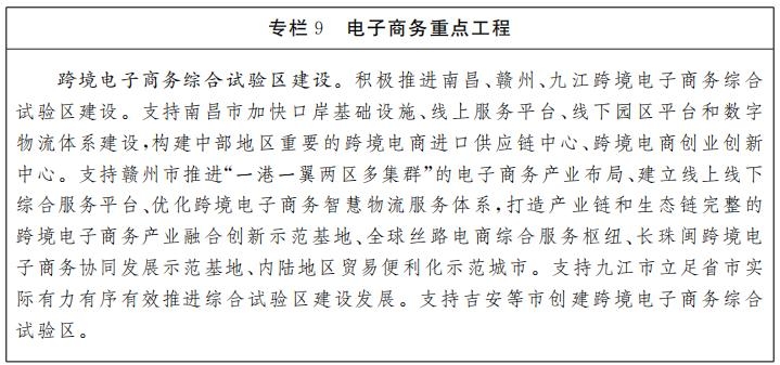 電子商務(wù)平臺(tái)建設(shè)。提升電子商務(wù)面向工業(yè)和農(nóng)業(yè)的服務(wù)能力。推進(jìn)重點(diǎn)產(chǎn)業(yè)與電子商務(wù)深度融合,加快工業(yè)電子商務(wù)平臺(tái)普及應(yīng)用,支持重點(diǎn)行業(yè)領(lǐng)軍企業(yè)建設(shè)一批專業(yè)性、特色化工業(yè)電子商務(wù)平臺(tái),加強(qiáng)電子商務(wù)平臺(tái)與工業(yè)生產(chǎn)數(shù)據(jù)對(duì)接。探索以產(chǎn)業(yè)融合為主要特色的內(nèi)陸地區(qū)跨境電子商務(wù)發(fā)展新模式,推進(jìn)跨境電子商務(wù)綜合試驗(yàn)區(qū)建設(shè),加快構(gòu)建跨境電子商務(wù)綜合服務(wù)平臺(tái)。深入推進(jìn)電子商務(wù)平臺(tái)向農(nóng)村延伸,實(shí)施“互聯(lián)網(wǎng)+”農(nóng)產(chǎn)品出村進(jìn)城工程,助力江西茶葉、贛南臍橙、南豐蜜楠、鄱陽湖水產(chǎn)、高山油茶等名優(yōu)特色農(nóng)產(chǎn)品出村進(jìn)城,推進(jìn)電子商務(wù)平臺(tái)與物流配送設(shè)施協(xié)同部署。實(shí)施“贛品網(wǎng)上行”,打造一批特色電商小鎮(zhèn)(村)、淘寶村(鎮(zhèn)),鼓勵(lì)有序發(fā)展農(nóng)村電商直播和基地直采等新模式,多方拓寬農(nóng)產(chǎn)品銷售渠道。支持發(fā)展平臺(tái)經(jīng)濟(jì)、網(wǎng)紅經(jīng)濟(jì)、直播經(jīng)濟(jì)、社交電商等電子商務(wù)新業(yè)態(tài),培育一批數(shù)字商務(wù)企業(yè)。