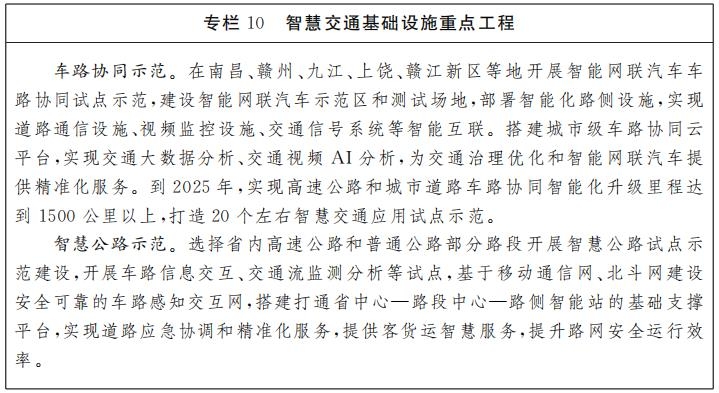 智慧交通基礎(chǔ)設(shè)施建設(shè)。推動(dòng)全省交通大數(shù)據(jù)中心建設(shè),整合公路、鐵路、水路、民航等各類交通數(shù)據(jù),探索建設(shè)多式聯(lián)運(yùn)綜合運(yùn)輸服務(wù)平臺(tái)體系。支持各設(shè)區(qū)市建設(shè)城市交通大腦,強(qiáng)化交通大數(shù)據(jù)分析、交通視頻AI分析等能力,建設(shè)標(biāo)準(zhǔn)統(tǒng)一、開放共享的智能網(wǎng)聯(lián)汽車大數(shù)據(jù)基礎(chǔ)平臺(tái)。推進(jìn)智慧道路基礎(chǔ)設(shè)施建設(shè),加強(qiáng)車用無線通信網(wǎng)絡(luò)(LTE-V2X)覆蓋,推進(jìn)新一代車用無線通信網(wǎng)絡(luò)(5G-V2X)在部分城市道路、高速公路重點(diǎn)路段試點(diǎn)示范。分區(qū)域開展景區(qū)、園區(qū)、港口等重點(diǎn)區(qū)域城市道路設(shè)施智能化改造,統(tǒng)籌部署高清攝像頭、激光雷達(dá)、毫米波雷達(dá)、智能交通信號(hào)燈、基于蜂窩車聯(lián)網(wǎng)(C-V2X)的路側(cè)單元等智能設(shè)備。在南昌、贛州、九江、上饒、贛江新區(qū)等地建設(shè)自動(dòng)駕駛測(cè)試道路場(chǎng)景,高標(biāo)準(zhǔn)建設(shè)昌九高速智慧高速公路試點(diǎn)項(xiàng)目,打造江西智慧高速公路標(biāo)桿和國(guó)內(nèi)綜合性智能駕駛創(chuàng)新示范樣板。支持已有軌道交通的設(shè)區(qū)市建設(shè)地鐵大數(shù)據(jù)平臺(tái),加快基于人臉識(shí)別技術(shù)的智慧安檢設(shè)施建設(shè),探索開展基于5G網(wǎng)絡(luò)的軌道交通車載視頻和監(jiān)測(cè)數(shù)據(jù)回傳應(yīng)用。推進(jìn)南昌昌北國(guó)際機(jī)場(chǎng)等設(shè)施智能化升級(jí),完善高清視頻監(jiān)控、AR智能眼鏡等智能設(shè)施部署。加快內(nèi)河水運(yùn)數(shù)字化改造,提升港口集裝箱裝卸、理貨等智能化水平。