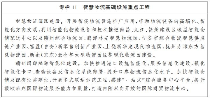 智慧物流基礎(chǔ)設(shè)施建設(shè)。加快全省物流大數(shù)據(jù)中心、省交通運(yùn)輸物流綜合公共信息平臺(tái)建設(shè),促進(jìn)物流與鐵路、民航、海關(guān)、商務(wù)等部門數(shù)據(jù)交換共享,實(shí)現(xiàn)全省物流信息化率達(dá)到90%以上。加快萬佶、天合、四順等智慧物流服務(wù)平臺(tái)建設(shè),支持萬佶物流構(gòu)建國(guó)家物流大數(shù)據(jù)中心。推動(dòng)省級(jí)物流公共信息平臺(tái)與大型物流企業(yè)數(shù)據(jù)互聯(lián)互通,整合分散的社會(huì)物流資源,構(gòu)建縣鄉(xiāng)村三級(jí)智慧物流網(wǎng)絡(luò)。鼓勵(lì)城鄉(xiāng)配送、冷鏈物流、藥品物流等大數(shù)據(jù)平臺(tái)發(fā)展。推動(dòng)省內(nèi)物流園區(qū)與國(guó)家骨干物流園區(qū)“互聯(lián)互通”工程對(duì)接,促進(jìn)物流資源協(xié)同、交易撮合。加快物流設(shè)施智能化改造,加強(qiáng)AGV、無人機(jī)、巡檢機(jī)器人、分揀機(jī)器人等智能設(shè)備在物流園區(qū)和大型倉儲(chǔ)中心應(yīng)用推廣。推動(dòng)京東南昌亞洲一號(hào)、蘇寧易購電商物流中心等開展基于“信息系統(tǒng)+貨架+托盤+叉車”的智能倉儲(chǔ)設(shè)施建設(shè)。推進(jìn)口岸設(shè)施和倉儲(chǔ)設(shè)施智能化改造,推動(dòng)九江港“5G+智慧港口”、贛州國(guó)際智慧陸港建設(shè)。加快快遞智能分揀設(shè)施建設(shè),支持南昌、贛州、鷹潭、吉安、上饒等地建設(shè)快遞智能分揀中心。拓展智能末端配送設(shè)施覆蓋范圍,加快智能取件箱布局,實(shí)現(xiàn)城市住宅小區(qū)無接觸智能快件箱覆蓋率達(dá)90%。