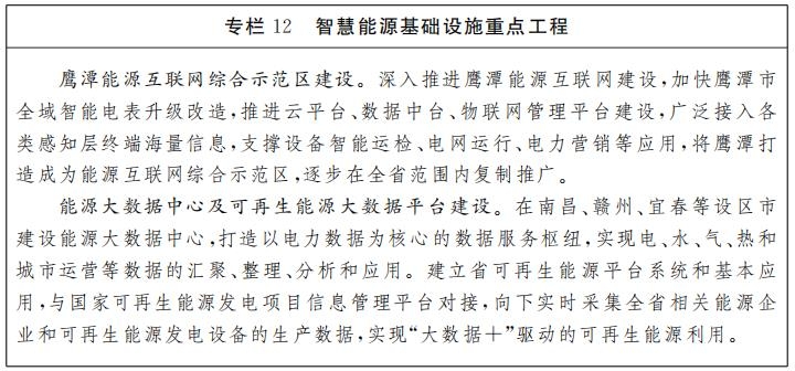 智慧能源基礎(chǔ)設(shè)施建設(shè)。加快供電—輸變電—配電—用電側(cè)設(shè)備智能化升級(jí)和感知設(shè)施部署,按需建設(shè)智能物聯(lián)網(wǎng)網(wǎng)關(guān),打造立體化全息電力感知網(wǎng)絡(luò)。加快部署智能充電設(shè)施,探索開展智能換電模式試點(diǎn)。構(gòu)建無人機(jī)、智能機(jī)器人等巡檢系統(tǒng),加強(qiáng)對(duì)電廠、變電站、地下管廊以及架空導(dǎo)線等重點(diǎn)區(qū)域覆蓋。高質(zhì)量推進(jìn)鷹潭市電力物聯(lián)網(wǎng)綜合示范區(qū)建設(shè),加強(qiáng)經(jīng)驗(yàn)推廣,提升江西電網(wǎng)智能化水平。推進(jìn)特高壓電網(wǎng)、油氣管線等能源工程智能化建設(shè),搭建綜合管理信息平臺(tái),實(shí)現(xiàn)全智能化運(yùn)營(yíng)。推進(jìn)以電網(wǎng)為中樞、多種能源形態(tài)協(xié)同轉(zhuǎn)化、集中式與分布式能源協(xié)同運(yùn)行的綜合能源網(wǎng)絡(luò)建設(shè),打造能源互聯(lián)網(wǎng)示范應(yīng)用城市。推廣鷹潭市“多表合一”經(jīng)驗(yàn),持續(xù)推動(dòng)全省電、氣、熱等多種能源消費(fèi)信息的集中自動(dòng)采集和跨行業(yè)信息共享。推進(jìn)能源大數(shù)據(jù)中心和省級(jí)可再生能源大數(shù)據(jù)平臺(tái)建設(shè),促進(jìn)能源行業(yè)數(shù)據(jù)統(tǒng)一歸集、統(tǒng)籌管理和創(chuàng)新應(yīng)用。搭建全省統(tǒng)一的新能源汽車智能充電設(shè)施服務(wù)網(wǎng)絡(luò),推動(dòng)南昌、九江、贛州、上饒、宜春等率先開展新能源汽車智能無線充電設(shè)施試點(diǎn)建設(shè)。推動(dòng)電網(wǎng)和數(shù)網(wǎng)統(tǒng)籌布局、聯(lián)動(dòng)建設(shè),切實(shí)降低數(shù)據(jù)中心用電成本。