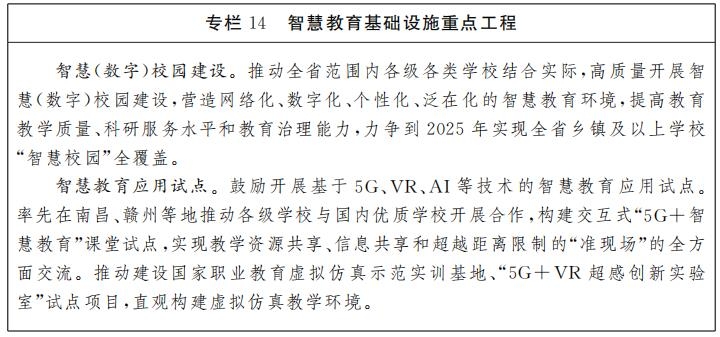 智慧教育基礎(chǔ)設(shè)施建設(shè)。優(yōu)化升級(jí)學(xué)校網(wǎng)絡(luò)接入和帶寬條件,推動(dòng)5G網(wǎng)絡(luò)校園覆蓋。推進(jìn)各級(jí)各類學(xué)校智慧校園建設(shè),充分利用“5G+VR”等技術(shù)建設(shè)智慧教室、智慧實(shí)驗(yàn)室、全息課堂等具有實(shí)踐性和互動(dòng)性的學(xué)科教室,加快建設(shè)在線智能教室、虛擬工廠、數(shù)字圖書館等智能學(xué)習(xí)空間,形成泛在化、智能化學(xué)習(xí)體系。加強(qiáng)職業(yè)院校、高校虛擬仿真實(shí)訓(xùn)教學(xué)環(huán)境建設(shè),打造一批融合仿真技術(shù)、體感技術(shù)等新技術(shù)的職業(yè)教育信息化實(shí)訓(xùn)基地,提升職業(yè)學(xué)校教學(xué)水平。推動(dòng)各類學(xué)校接入江西省教育資源公共服務(wù)平臺(tái)“贛教云”,推進(jìn)“互聯(lián)網(wǎng)+教育”大平臺(tái)建設(shè),建設(shè)江西省“名師課堂”“名校網(wǎng)絡(luò)課堂”,普及“智慧作業(yè)”在高年級(jí)應(yīng)用,擴(kuò)大優(yōu)質(zhì)教育資源覆蓋范圍,實(shí)現(xiàn)“優(yōu)質(zhì)資源班班通”。探索發(fā)展數(shù)字化、在線化老年大學(xué)、學(xué)歷教育、社會(huì)培訓(xùn)等特色教育,推動(dòng)其他數(shù)字校園資源向特色教育機(jī)構(gòu)開放。