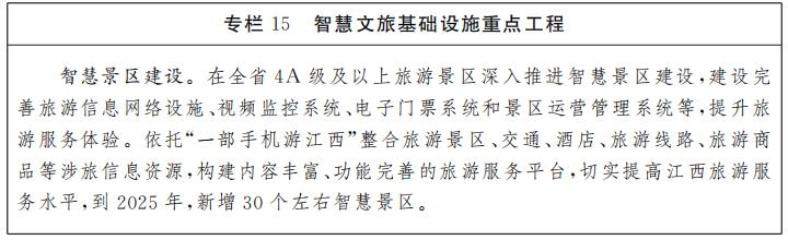 智慧文旅基礎(chǔ)設(shè)施建設(shè)。推進(jìn)“一部手機(jī)游江西”建設(shè),依托全省智慧旅游大數(shù)據(jù)中心,橫向融合交通、商務(wù)、市場(chǎng)監(jiān)管、民航、鐵路、氣象等部門涉旅數(shù)據(jù),縱向歸集省市縣及景區(qū)涉旅數(shù)據(jù),建成綜合性旅游智慧平臺(tái)。完善“云游江西”旅游推廣平臺(tái)并接入“贛服通”,將其打造成江西旅游宣傳推廣的官方助手。推進(jìn)4A級(jí)及以上旅游景區(qū)智慧化建設(shè),實(shí)現(xiàn)智能導(dǎo)游、電子講解、智能找?guī)?、智慧停車等功能全覆蓋。推動(dòng)各級(jí)各類公共文化服務(wù)場(chǎng)館寬帶網(wǎng)絡(luò)全覆蓋,推進(jìn)數(shù)字圖書館、數(shù)字文化館、數(shù)字博物館和數(shù)字非物質(zhì)文化遺產(chǎn)等智慧場(chǎng)館建設(shè),提升公共數(shù)字文化服務(wù)水平。加快實(shí)現(xiàn)4A級(jí)及以上景區(qū)、重點(diǎn)公共文化服務(wù)場(chǎng)所5G信號(hào)全覆蓋。推動(dòng)文化和旅游服務(wù)應(yīng)用場(chǎng)景智能化設(shè)施部署,運(yùn)用人機(jī)交互、VR/AR、全息等技術(shù)打造交互式文化體驗(yàn)專區(qū),增強(qiáng)公共文化服務(wù)互動(dòng)性和趣味性。