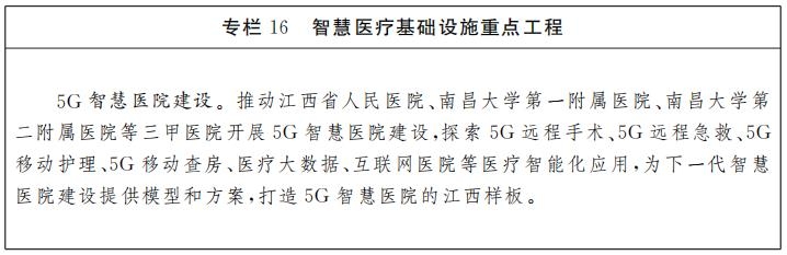 智慧醫(yī)療基礎(chǔ)設(shè)施建設(shè)。完善區(qū)域全民健康信息平臺(tái),加強(qiáng)全民健康信息化互聯(lián)互通,促進(jìn)數(shù)據(jù)共享和業(yè)務(wù)協(xié)同。完善城鄉(xiāng)三級(jí)醫(yī)療服務(wù)網(wǎng)絡(luò),促進(jìn)“縣鄉(xiāng)一體、鄉(xiāng)村一體”。推動(dòng)醫(yī)療機(jī)構(gòu)接入省級(jí)遠(yuǎn)程醫(yī)療服務(wù)平臺(tái),構(gòu)建省市縣鄉(xiāng)四級(jí)遠(yuǎn)程醫(yī)療服務(wù)體系。促進(jìn)省域內(nèi)優(yōu)質(zhì)醫(yī)療資源擴(kuò)容和均衡布局,推進(jìn)省級(jí)區(qū)域醫(yī)療中心建設(shè)。鼓勵(lì)有條件的公立醫(yī)院、醫(yī)聯(lián)體建設(shè)互聯(lián)網(wǎng)醫(yī)院,重點(diǎn)打造省級(jí)、設(shè)區(qū)市級(jí)互聯(lián)網(wǎng)醫(yī)院。鼓勵(lì)醫(yī)院加快院內(nèi)系統(tǒng)上云和集成整合,構(gòu)建集醫(yī)療、服務(wù)、管理“三位一體”的智慧醫(yī)院系統(tǒng)。創(chuàng)新“5G+醫(yī)療”“VR+醫(yī)療”等新模式應(yīng)用,加快電子健康碼應(yīng)用,鼓勵(lì)各地開展AI輔助診療平臺(tái)和智能醫(yī)療影像云建設(shè),推進(jìn)江西特色智慧醫(yī)療建設(shè)。
