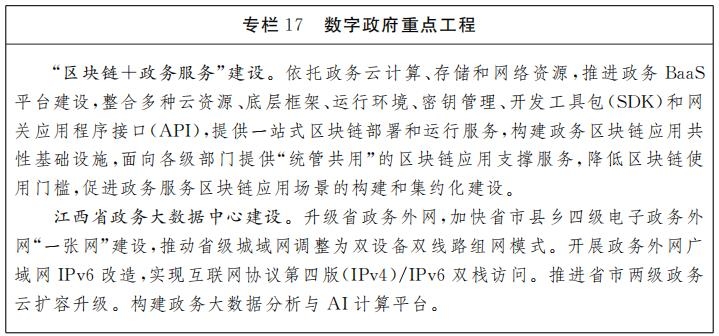 數(shù)字政府建設(shè)。推動(dòng)省市縣鄉(xiāng)四級(jí)政務(wù)外網(wǎng)建設(shè)和擴(kuò)容。推進(jìn)省市縣一體化政務(wù)大數(shù)據(jù)中心建設(shè),完善省級(jí)數(shù)據(jù)共享交換平臺(tái),實(shí)現(xiàn)與各設(shè)區(qū)市、各部門互聯(lián)。打造省市兩級(jí)政務(wù)大數(shù)據(jù)資源池和數(shù)據(jù)服務(wù)平臺(tái),為全省提供一體化的公共基礎(chǔ)數(shù)據(jù)庫服務(wù)、大數(shù)據(jù)分析與AI算力服務(wù)。加快推進(jìn)基于區(qū)塊鏈技術(shù)的數(shù)據(jù)共享體系和政務(wù)應(yīng)用平臺(tái)建設(shè),形成具有代表性的區(qū)塊鏈技術(shù)創(chuàng)新政務(wù)服務(wù)應(yīng)用場(chǎng)景。探索構(gòu)建“目錄區(qū)塊鏈”系統(tǒng)等區(qū)塊鏈應(yīng)用平臺(tái),推進(jìn)多層級(jí)政務(wù)數(shù)據(jù)、社會(huì)數(shù)據(jù)的共享開放。持續(xù)推進(jìn)“一化三通”,統(tǒng)籌規(guī)劃建設(shè)全省電子政務(wù)一體化大平臺(tái),形成“覆蓋全省、共建共用、統(tǒng)一接入”的數(shù)字政府建設(shè)技術(shù)總體架構(gòu)。加快一體化在線政務(wù)服務(wù)平臺(tái)五級(jí)全覆蓋,優(yōu)化升級(jí)“贛服通”服務(wù)功能,實(shí)現(xiàn)所有政務(wù)服務(wù)事項(xiàng)“應(yīng)上盡上”。加強(qiáng)“贛政通”建設(shè),實(shí)現(xiàn)省市縣三級(jí)全覆蓋。