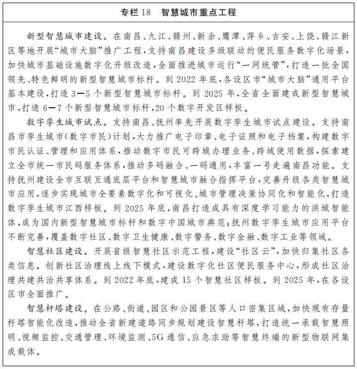新型智慧城市建設(shè)。加快市政基礎(chǔ)設(shè)施智能化改造,統(tǒng)籌推進(jìn)道路橋梁、地下管網(wǎng)(線)、公共空間、樓宇建筑等重點(diǎn)部位感知設(shè)施部署,構(gòu)建立體化城市“神經(jīng)網(wǎng)絡(luò)”。深化共建共享,加快多功能智慧桿塔建設(shè),開放社會(huì)桿塔和通信桿塔資源,推進(jìn)“多桿合一”,強(qiáng)化集約共享。推動(dòng)各設(shè)區(qū)市建立城市級(jí)物聯(lián)感知設(shè)施管理平臺(tái),實(shí)現(xiàn)數(shù)字化城市部件、感知設(shè)施統(tǒng)一接入、協(xié)同調(diào)度、全生命周期管理。統(tǒng)籌推進(jìn)智慧城市數(shù)據(jù)中臺(tái)、智慧城市共性技術(shù)能力支撐平臺(tái)建設(shè),形成面向全市的大數(shù)據(jù)、AI、區(qū)塊鏈等基礎(chǔ)服務(wù)體系。加快各設(shè)區(qū)市“城市大腦”、智慧社區(qū)、智慧商圈、智慧園區(qū)建設(shè),搭建多級(jí)聯(lián)動(dòng)的數(shù)字化城市管理平臺(tái),實(shí)現(xiàn)城市運(yùn)行“一網(wǎng)統(tǒng)管”。推進(jìn)新余、宜春、吉安、萍鄉(xiāng)等地智慧城市應(yīng)用,推進(jìn)智慧縣城示范項(xiàng)目建設(shè)。探索建設(shè)一批數(shù)字孿生城市,構(gòu)建“全周期”閉環(huán)管理的城市智慧治理體系。