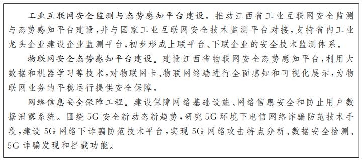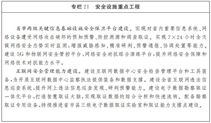 持續(xù)加強(qiáng)網(wǎng)絡(luò)安全保障能力。切實(shí)強(qiáng)化關(guān)鍵信息基礎(chǔ)設(shè)施保護(hù)力度和網(wǎng)絡(luò)空間治理管控能力,落實(shí)網(wǎng)絡(luò)安全等級(jí)保護(hù)制度和關(guān)鍵信息基礎(chǔ)設(shè)施安全保護(hù)制度,對(duì)重要系統(tǒng)和數(shù)據(jù)庫進(jìn)行容災(zāi)備份,采用防火墻、加密認(rèn)證等措施保障信息基礎(chǔ)設(shè)施免受干擾、破壞或者未經(jīng)授權(quán)的訪問。提升互聯(lián)網(wǎng)違法信息監(jiān)測(cè)研判能力,有效預(yù)防網(wǎng)絡(luò)違法信息風(fēng)險(xiǎn)。在5G、寬帶網(wǎng)絡(luò)、物聯(lián)網(wǎng)、工業(yè)互聯(lián)網(wǎng)、數(shù)據(jù)中心等設(shè)施建設(shè)過程中,同步規(guī)劃、建設(shè)、運(yùn)行網(wǎng)絡(luò)安全保護(hù)系統(tǒng),保障設(shè)施的安全可靠性。綜合利用AI、大數(shù)據(jù)、物聯(lián)網(wǎng)智能感知、軟件定義安全、安全虛擬化等新技術(shù),建設(shè)全省網(wǎng)絡(luò)安全態(tài)勢(shì)感知和網(wǎng)絡(luò)安全監(jiān)測(cè)系統(tǒng)、攻擊溯源和智能阻斷系統(tǒng)、網(wǎng)絡(luò)安全攻防演練平臺(tái)、面向泛在全連接應(yīng)用場(chǎng)景的智能安全防御系統(tǒng)等,構(gòu)建全方位全覆蓋安全防護(hù)體系,提升監(jiān)測(cè)預(yù)警和處置應(yīng)對(duì)能力。推動(dòng)單點(diǎn)式安全防護(hù)向規(guī)?;雷o(hù)轉(zhuǎn)型,建設(shè)形成覆蓋終端、網(wǎng)絡(luò)、云、數(shù)據(jù)和應(yīng)用的多層級(jí)縱深防御、安全威脅精準(zhǔn)識(shí)別和高效聯(lián)動(dòng)的安全服務(wù)能力。