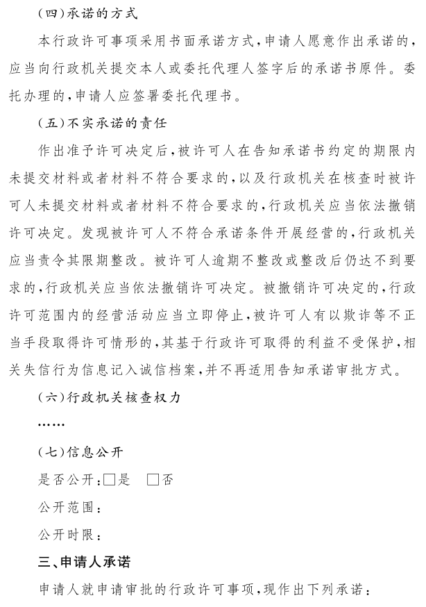 (三)制定具體工作規(guī)程。省直有關(guān)部門(mén)要會(huì)同市縣相關(guān)部門(mén)按照全面準(zhǔn)確、權(quán)責(zé)清晰的要求,對(duì)本系統(tǒng)內(nèi)實(shí)行告知承諾制的涉企經(jīng)營(yíng)許可事項(xiàng),逐項(xiàng)編制告知承諾具體工作規(guī)程,明確實(shí)行告知承諾制的許可條件、許可材料、證明事項(xiàng),制作告知承諾書(shū)格式文本(附件2),科學(xué)制定核查機(jī)制和監(jiān)管措施。行政機(jī)關(guān)應(yīng)當(dāng)按照精簡(jiǎn)、明確、便利的要求,修訂完善辦事指南,在辦事指南中依法準(zhǔn)確列出辦理實(shí)行告知承諾制的涉企經(jīng)營(yíng)許可事項(xiàng)的許可條件、需要提交的材料、可以減省的材料等,不得含有如“法律法規(guī)規(guī)定的其他條件”“政府部門(mén)認(rèn)為必要的其他條件”之類(lèi)的兜底性條款。告知承諾制辦事指南、告知承諾書(shū)格式文本要通過(guò)辦事大廳、門(mén)戶網(wǎng)站和江西一體化政務(wù)服務(wù)平臺(tái)等渠道公布,方便申請(qǐng)人查閱、索取及下載。對(duì)因企業(yè)承諾可以減省的審批材料,不再要求企業(yè)當(dāng)場(chǎng)提供;對(duì)可在企業(yè)領(lǐng)證之后補(bǔ)交的審批材料,實(shí)行容缺受理、限期補(bǔ)交。能夠提供電子證照的,原則上免于提交實(shí)體證照。