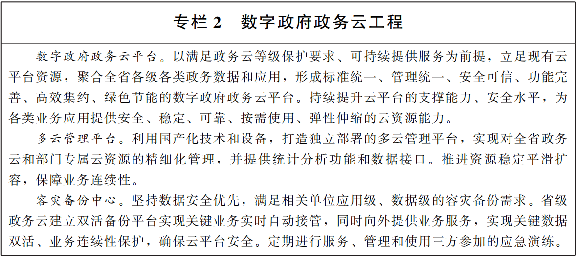 2.提供開(kāi)放共享的政務(wù)云服務(wù)。堅(jiān)持省級(jí)統(tǒng)籌,整合現(xiàn)有云資源,完善省市兩級(jí)政務(wù)云平臺(tái),推動(dòng)系統(tǒng)遷移上云。建設(shè)多云管理平臺(tái),對(duì)數(shù)字政府政務(wù)云平臺(tái)進(jìn)行統(tǒng)一管理、監(jiān)控和運(yùn)維。同步建設(shè)容災(zāi)備份設(shè)施,完善應(yīng)急保障機(jī)制,確保政務(wù)云穩(wěn)定安全可靠。