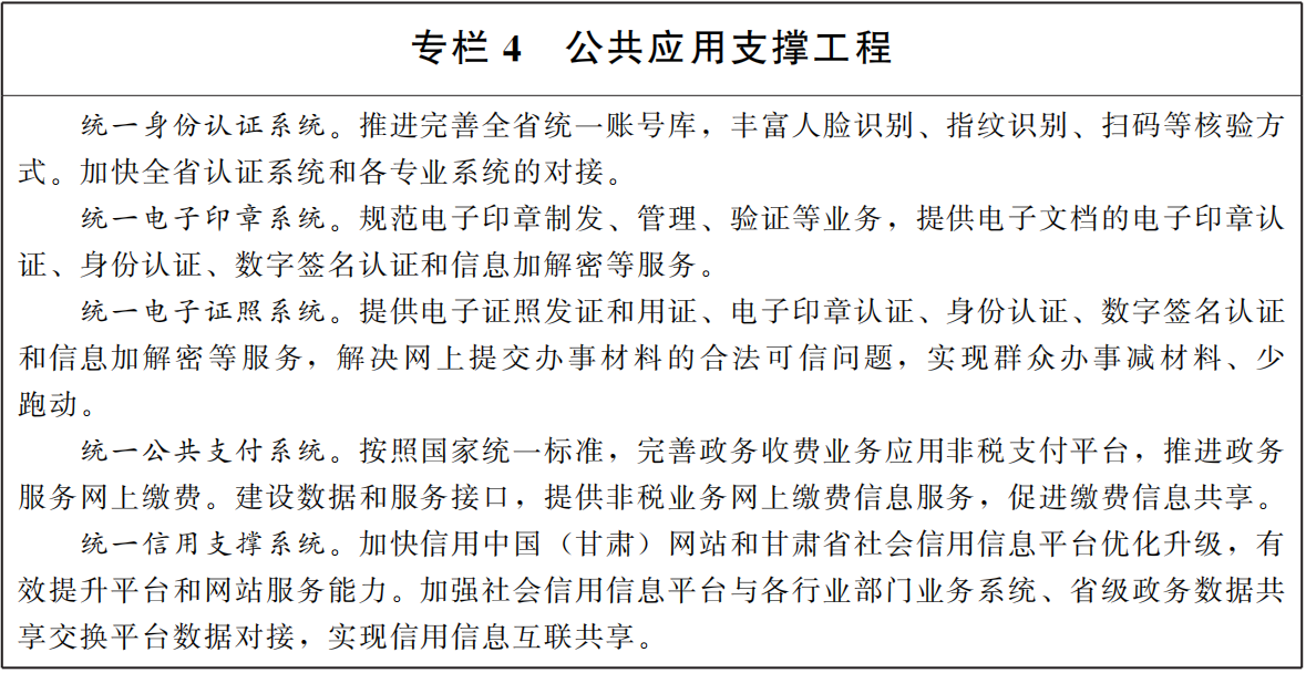 4,建設(shè)公共應(yīng)用支撐體系。按照全省數(shù)字政府統(tǒng)一技術(shù)架構(gòu)體系,建設(shè)應(yīng)用系統(tǒng)基礎(chǔ)支撐體系,為各級(jí)各部門(mén)和各類(lèi)應(yīng)用系統(tǒng)提供公共應(yīng)用支撐保障。