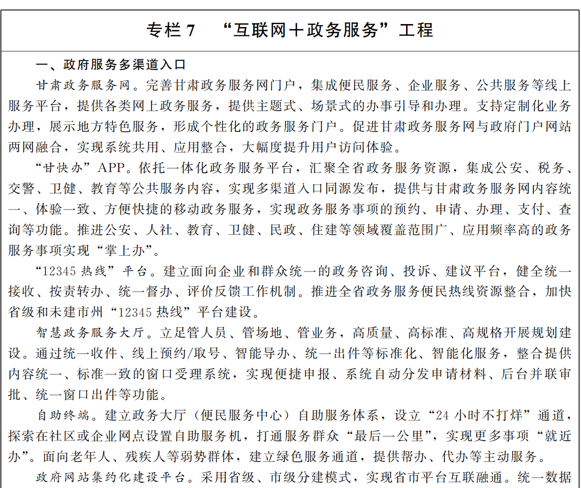 推動(dòng)政務(wù)服務(wù)規(guī)范化。統(tǒng)籌歸并網(wǎng)上辦事入口,推動(dòng)多渠道無(wú)差別服務(wù),持續(xù)優(yōu)化甘肅政務(wù)服務(wù)網(wǎng)、“甘快辦”APP、“12345熱線”,實(shí)現(xiàn)網(wǎng)上辦事“一次注冊(cè)、多點(diǎn)互認(rèn)、全網(wǎng)通行”。規(guī)范網(wǎng)上辦事指引,提供更加簡(jiǎn)便易懂的辦事指南和線上辦事操作說(shuō)明,創(chuàng)新在線導(dǎo)辦、智能推薦等手段,實(shí)現(xiàn)“一端在手、一看就懂、一點(diǎn)就能辦”。深化各級(jí)政府網(wǎng)站、政務(wù)服務(wù)平臺(tái)適老化、無(wú)障礙改造。建設(shè)全科無(wú)差別受理智慧政務(wù)服務(wù)大廳,統(tǒng)籌推進(jìn)線上線下服務(wù)融合互通,提升政務(wù)服務(wù)便捷性。