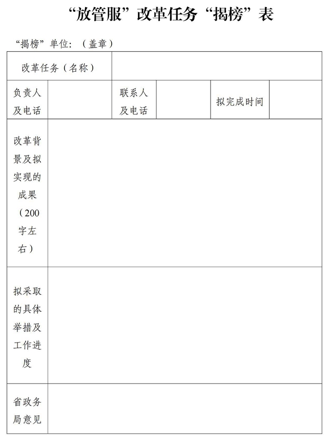 (三)縣市區(qū)既可“揭榜”省、市級(jí)改革任務(wù)清單,還可以根據(jù)本地實(shí)際開展改革創(chuàng)新,主動(dòng)探索推進(jìn)省市清單之外的改革,并向市級(jí)、省級(jí)政務(wù)管理服務(wù)部門報(bào)備(填寫附件2表格)。