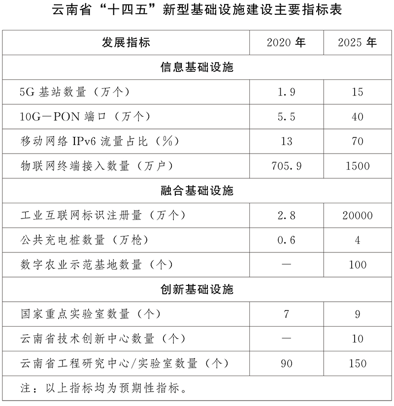 到2025年,初步構建系統(tǒng)完備、高效實用、智能綠色、安全可靠的新型基礎設施體系,信息基礎設施建設實現(xiàn)快速發(fā)展,工業(yè)互聯(lián)網、智慧能源、智慧旅游等融合基礎設施領域建成一批全國標桿,創(chuàng)新基礎設施建設水平顯著提升,新型基礎設施成為數(shù)字云南建設和云南高質量跨越式發(fā)展的重要支撐。