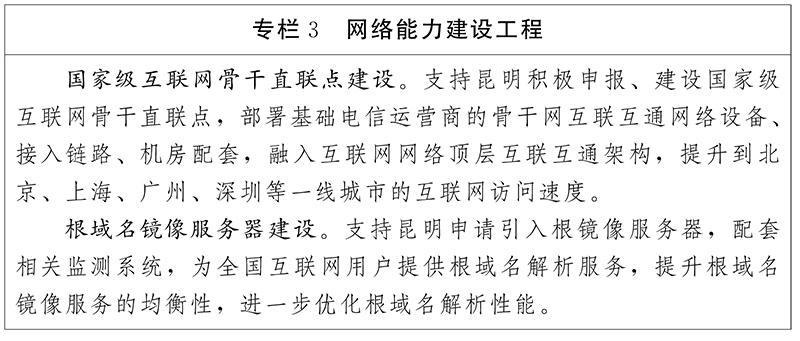 ——信息基礎設施建設實現(xiàn)新跨越。昆明國際通信出入口局向全業(yè)務拓展。5G網絡設施在西部地區(qū)處于前列,5G用戶占比達到60%以上,應用場景更加廣泛。建成昆明國家級互聯(lián)網骨干直聯(lián)點,全光網省建設不斷深化,千兆固定寬帶用戶占比達到30%。物聯(lián)網實現(xiàn)全省縣級以上主城區(qū)普遍覆蓋、重點區(qū)域深度覆蓋。互聯(lián)網協(xié)議第6版(IPv6)流量規(guī)模和網絡規(guī)??焖偬嵘H∫惑w化大數(shù)據中心體系建設深入推進,打造一批行業(yè)級大數(shù)據中心,全省數(shù)據中心整體利用率提高到50%以上。建成人工智能、區(qū)塊鏈等一批新技術應用基礎設施,數(shù)字技術創(chuàng)新活力得到充分釋放。