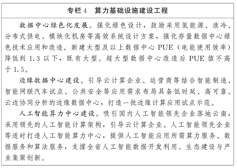 統(tǒng)籌全省算力基礎設施布局,結合實際應用需要,加快大數(shù)據中心、人工智能算力中心、邊緣數(shù)據中心建設。打造云南一體化大數(shù)據中心體系,構建布局均衡、協(xié)同供給、梯次連續(xù)的全省數(shù)據中心格局,積極融入國家一體化大數(shù)據中心體系。在昆明、玉溪、大理等地建設大數(shù)據中心省級樞紐節(jié)點,發(fā)展數(shù)據中心集群。支持曲靖、麗江、普洱、保山等地打造大數(shù)據中心次級節(jié)點,推動與全省大數(shù)據中心樞紐節(jié)點深度融合。支持邊緣數(shù)據中心建設,打造一批滿足低時延、高可靠要求的邊緣計算應用場景。積極引進國家級行業(yè)大數(shù)據中心落戶云南。部署人工智能算力中心,重點面向全省提供人工智能算力服務,同時承接東部地區(qū)算力需求外溢。完善數(shù)據中心發(fā)展配套環(huán)境,推動數(shù)據中心間高速度、大帶寬、低時延互聯(lián)網絡建設。鼓勵依法依規(guī)自主選擇參與電力市場化交易,降低用電成本。支持打造行業(yè)數(shù)據大腦,推動大數(shù)據在各行業(yè)各領域的融合應用。