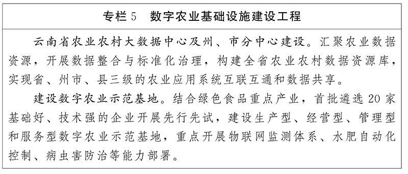 鼓勵農業(yè)生產企業(yè)在農業(yè)生產現(xiàn)場部署環(huán)境溫濕度、土壤水分、二氧化碳等各類傳感節(jié)點,支撐農業(yè)生產環(huán)境感知預警、可視管理、決策分析。深入推進云南省農業(yè)農村大數(shù)據中心建設,匯聚衛(wèi)星遙感、農情氣象、物聯(lián)網采集等多渠道農業(yè)數(shù)據。引導建設數(shù)字農業(yè)示范基地、智慧農業(yè)產業(yè)園區(qū)、智慧農場、智慧農產品生產保護區(qū)等載體,提升農業(yè)生產、加工、銷售各環(huán)節(jié)數(shù)字化水平。推進農村電商服務站點、農產品倉儲保鮮冷鏈流通網絡設施的數(shù)字化、智能化改造升級。