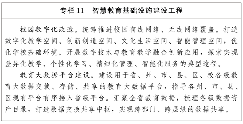 推廣智慧教育基礎設施。以學前、高中階段學校教育專網為重點,加快全省教育光纖網絡建設。推進多媒體互動教學設備在義務教育階段學校教學班的覆蓋,加強全省職業(yè)院校、高等院校虛擬沉浸、仿真實訓教學環(huán)境建設。
