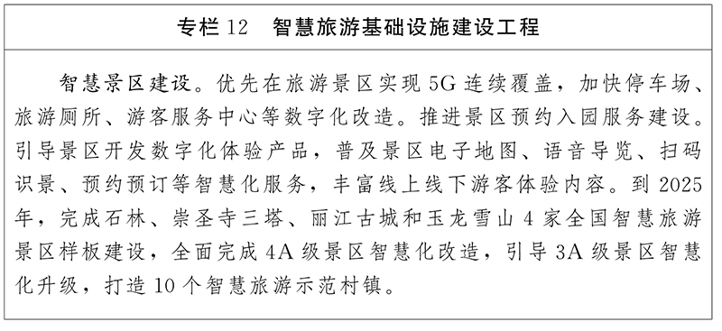 完善智慧文化旅游基礎設施。有序推進全省國家級及省級全域旅游示范區(qū)、旅游度假區(qū)、3A級以上景區(qū)等區(qū)域實現(xiàn)5G連續(xù)覆蓋,保障大密度客流環(huán)境及偏遠旅游區(qū)域的通信設備信號暢通。加快推進景區(qū)智慧化改造,鼓勵酒店部署刷臉入住、自助前臺等智能服務以及智能家居產品,提升旅游數(shù)字化服務能力和水平。推進旅游大數(shù)據中心建設,加快涉旅數(shù)據集中整合和開放共享。推進云南廣電大數(shù)據中心、智慧廣電融合媒體云、云上智慧云、云上文化云、“七彩云”智慧融媒體服務平臺等公共文化基礎設施建設。