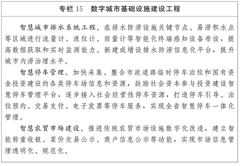 ——融合基礎設施建設邁上新臺階。建成100個數(shù)字農業(yè)示范基地,培育5個國家工業(yè)互聯(lián)網應用示范平臺,建成20個工業(yè)互聯(lián)網標識解析二級節(jié)點,建成一批智能電網示范區(qū),城鄉(xiāng)智能充電基礎設施全面覆蓋,旅游景區(qū)及服務場所數(shù)字化基礎設施建設取得顯著成效,物流數(shù)字化轉型深入推進。數(shù)字政府基礎設施服務能力顯著提升,數(shù)字生態(tài)監(jiān)測、治理效能大幅加強,全省數(shù)字化交通網、智慧應急體系基本建成。民生數(shù)字化服務能力大幅提升,建成一批智慧醫(yī)院和智慧校園。數(shù)字鄉(xiāng)村基礎設施建設快速推進,創(chuàng)建一批數(shù)字城市試點示范,城市建設管理運營能力快速增強。